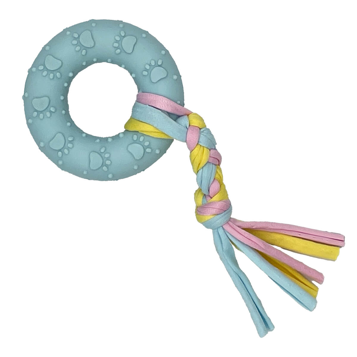 Paw Nibble Loop er en blød, bidering der et baby-sød! Blød tyggering i slidstærkt TPR-materiale, dekoreret med små poter – lige til at smelte over! Den flettede hale i pastelfarver giver ekstra sjov og taktile tyggeoplevelser for både små og store poter. Den er skånsom mod tænder og gummer og perfekt til hvalpe, der er ved at få bisser – men også for voksne hunde med hang til bløde tyggelegetøj.